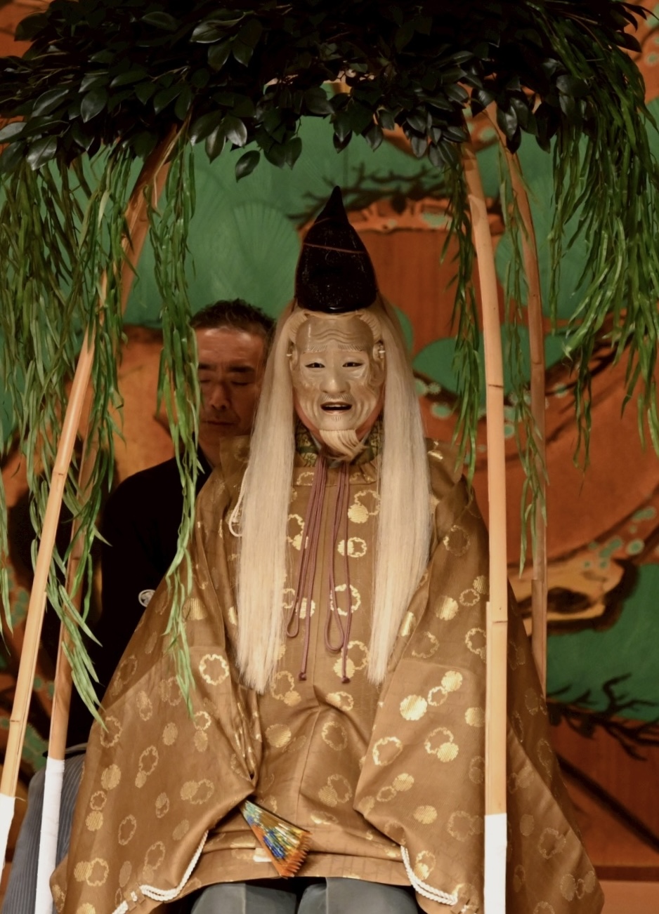 阿蘇の宮の神主友成(ワキ)は播磨国高砂にて老人夫婦(前シテとシテツレ)に高砂の松の謂れ、松の長久のめでたさ、相生(相老)の夫婦の情愛、和歌の徳の話を聞きます。やがて夫婦は高砂住の江の神だと告げ、住吉で待つと言って沖に出てしまいます。(中入)