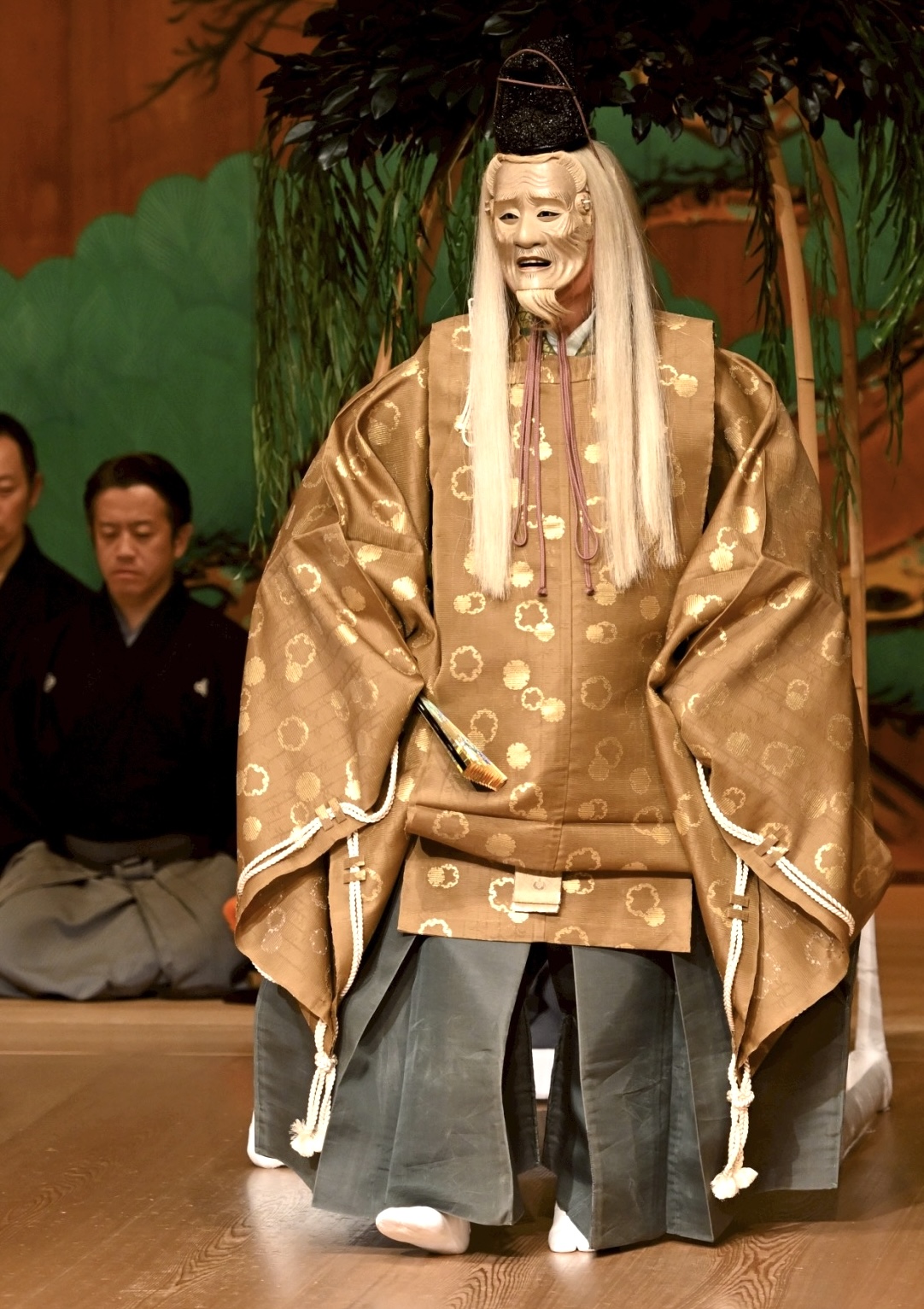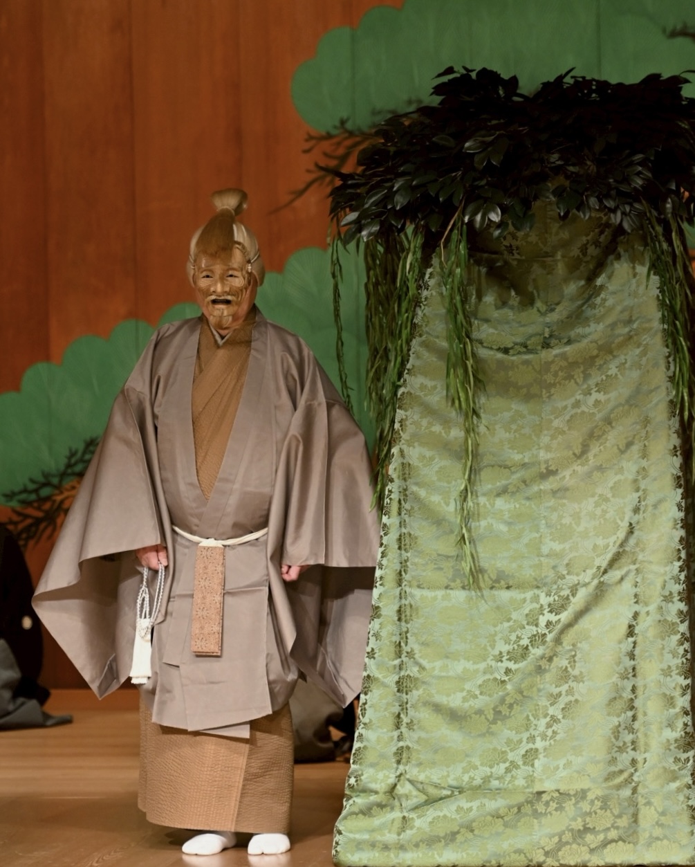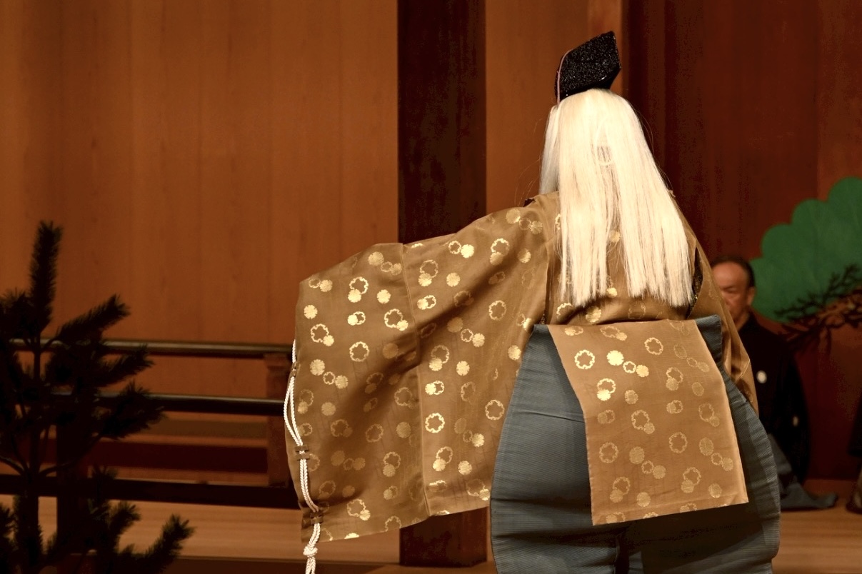 今回午後の公演のため下げ歌を省略し演能時間を短縮したため、私は杉箒で掻く型を、上げ歌の「木の下蔭の落ち葉かく」の謡で、通常の正面先ではなく常座で行いました。また、クセの後半は中啓で舞う型となるので、序にて杉箒を捨て、肩上げしている両袖を下ろし、中啓で勤めました。作り物の松を讃美するように招き扇をします。